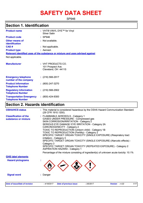 VHT(R) Vinyl Dye(TM) for vinyl and carpeting restores or changes the color of any vinyl upholstery, seats and trim, or the 'short nap' carpeting found in todays cars, boats and watercraft. It is ideal for use on stiff or pliable vinyl, simulated leather or plastic. It is extremely resistant to cracking or fading. Careful preparation is essential and all traces of dirt, silicone products, vinyl and rubber protectants, oils and greases must be removed. Incomplete preparation will not produce a satisfactory result.